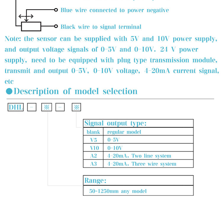 | Brief introduction:The linear displacement sensor based on potentiometer principle is a linear displacement sensor with sliding rheostat structure. The sensor can supply 5V or 10V power, output 0-5V, 0-10V voltage signal, or 12-24V power supply. It is equipped with transmission module to output 0-5V, 0-10V, 4-20mA analog signal, which is convenient to connect with PLC control system for processing and calculation.
